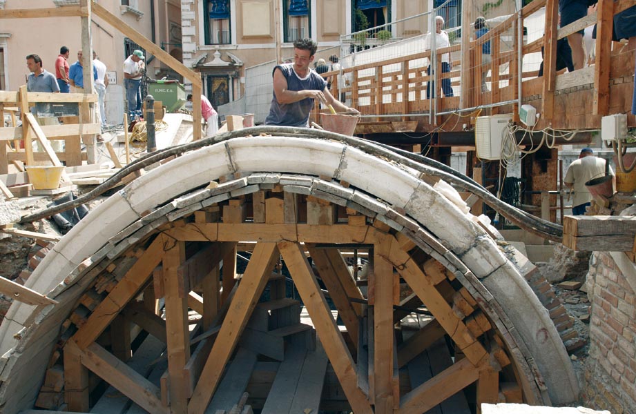 Anche i ponti in pietra, però, sono sottoposti a processi di degrado: distacco d’intonaco dalla superficie inferiore della volta, disallineamento delle armille, crepe, perdita di consistenza. Quando il deterioramente è irreparabile, il ponte viene ricostruito del tutto, come nel caso, ad esempio, del ponte de l’Osmarin e del ponte dei Greci. Sopra la superficie curva della cèntina (l’armatura di sostegno in legno che ricalca fedelmente la volta del ponte demolito) vengono allineate le armille in pietra per poi procedere alla costruzione della volta in mattoni. Quando non esistono percorsi alternativi nelle immediate vicinanze, si sopperisce alla viabilità interrotta con la formazione di ponti di servizio provvisori.